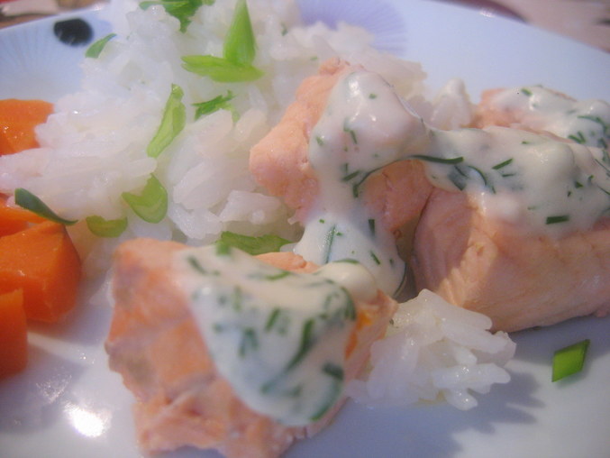 Варю кусочки филе семги с морковью, корешковым сельдереем, солью. Соус: сливки, мелко нарезанный укроп, 1 ст.л. муки для загустения в кастрюльку, взбиваю венчиком, начинает кипеть- выключаю. Рис (басмани)