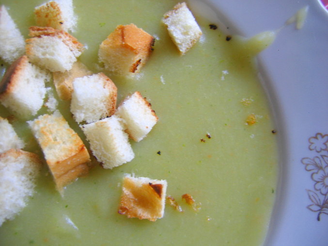 разные варианты. Можно за основу брать картофель, добавлять к нему морковь, лук, черешковый сельдерей, соль, перец, иногда кладу немного приправы хмели-сунели. Можно за основу брать брокколи, опять же добавлять морковь, лук, сельдерей, цветную капусту. В общем, как вам нравится, любые овощные ингредиенты. Варю овощи, бульон сливаю в чашку (пригодится), измельчаю блендером до однородной массы (сельдерей вытаскиваю), постепенно вливаю бульон до получения желаемой консистенции супа. Режу хлеб (у нас всегда белый) на небольшие кубики, обжариваю на сковороде без масла. Добавляю в тарелку с супом-пюре.