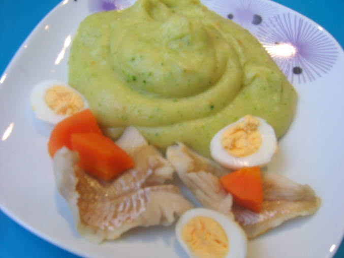 Получается во такое зеленоватое пюре (на тарелке с вареным хеком и перепелиными яйцами)