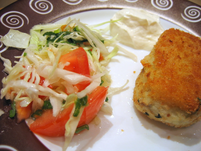 А рядом с салатом картофельные зразы (для мужа с шампиньонами, для ребенка- без грибов) Обжариваю в панировочных сухарях, мой ребенок очень любит картофельное пюре в таком исполнении из папиной тарелки)
