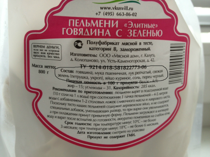 Фарш: свинина, говядина, вода, лук, соль, сахар, пряности. Тесто: мука в/с, вода, соль, яичный порошок, улучшитель муки.