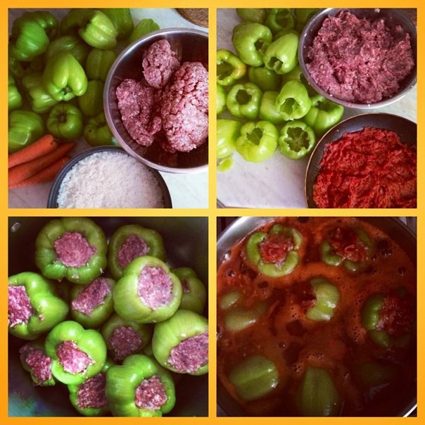 Ингредиенты: Перец,Мясной фарш (свинина + говядина), Рис, Помидоры, Томатная паста, Лук, Растительное масло, Соль, перец по вкусу.