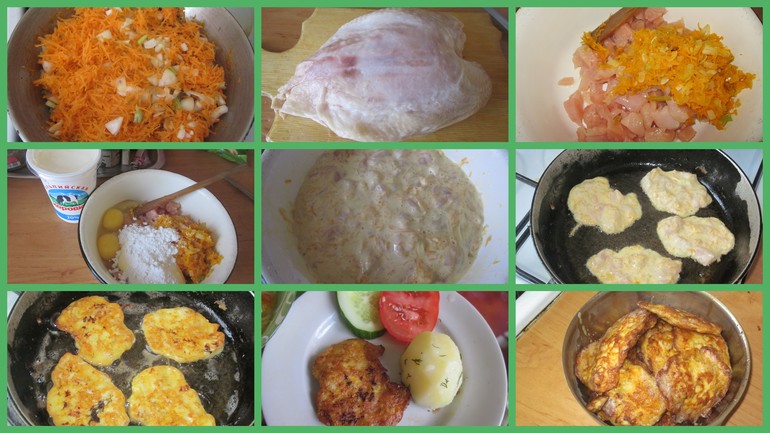 Приготовление: лук и морковь спасировать без масла на бульоне или воде, куриную грудку разделать и филе нарезать на кубики. Смешать курицу, овощи, яйца, сметану и соль, все вымешать. На сковороду налить 1 ч.л. раст. масла и немного воды или бульона, жарить котлетки как оладушки. По 2-3 минуты с каждой стороны. Готовые котлеты выложить на салфетки и обсушить хорошенько.