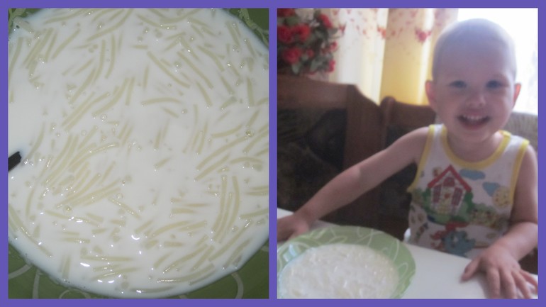 Молоко доводим до кипения, кладем вермишель, варим 3 минутки, добавляем 1 ч.л. сахара, выключаем.