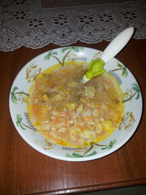 А масло-то зачем? Свинину ребенку вообще не даю, только говядину/индейку. На мой взгляд, суп жирный, он и взрослым то не очень полезен, а ребенку тем более.