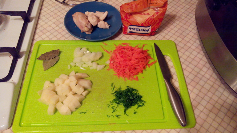 Морковь на терке, лук мелко порезать, картофель кубиками мелко. Мясо грудки режу по-мельче, а крылышко так пока бросаю. Немного укропа и лавровый лист.