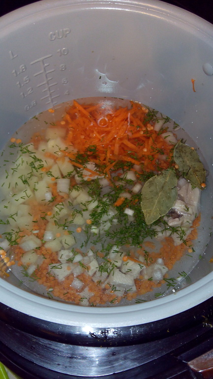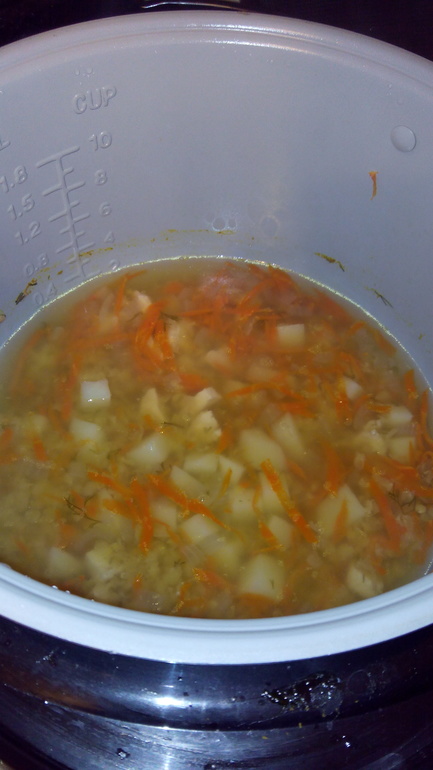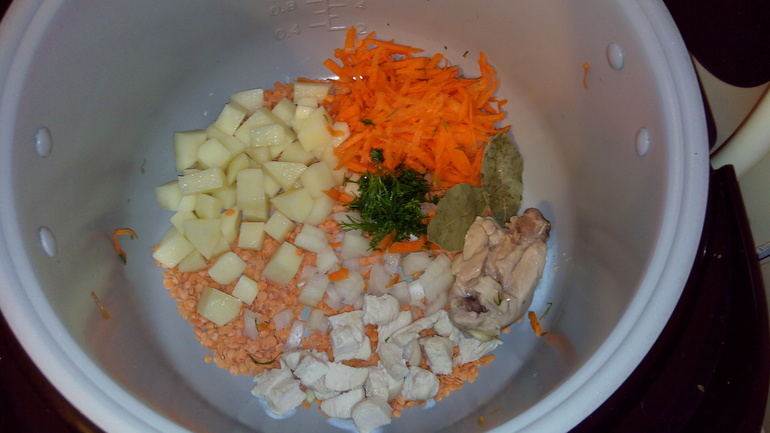 Дальше все это загружаю в мультиварку. Чечевицы я первый раз кинула 5 ст. ложек. (Потом думаю больше можно, супик жидковат получился. ) совсем чуток кидаю соли и воды. Все делаю на глаз, ну у меня примерно 800 мл.
