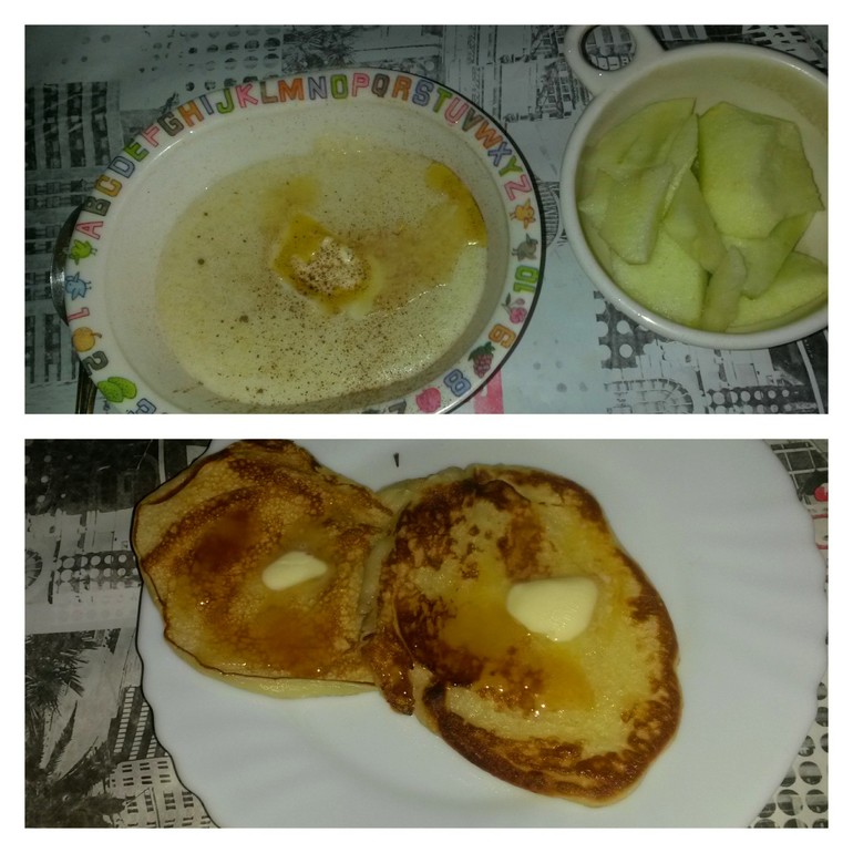 У нас сегодня день свининки.Кусок достала постный, одно мясо.Надеюсь снова подкину идей чем накормить семью и деточек в частном.Итак,сегодня у нас...1.Завтрак -пшеная кашка с корицей и зеленым яблоком.2.Обед -борщ ,муж с отбивными;а сынок с котлеткой запеченой в духовке.3.Полдник-банановые оладушки на кефире с медом.