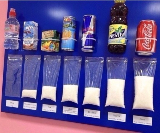 Хочу автора удивить еще больше, в этих напитках сахара и в помине нет, а есть самый дешевый сахарозам. По объему его нужно в разы меньше,а сладость в сравнении с указанным на плакате объемом сахара. Только сахарозам. гораздо вреднее. Его же и в конфеты,шоколад кладут и пр.пр.
