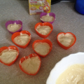 Её нам нужно налить в формочки. Хоть у меня и силиконовые, я все равно немного смазала их сливочным маслом. Наполняем формочки не полностью, потому что наши кексики поднимутся.
