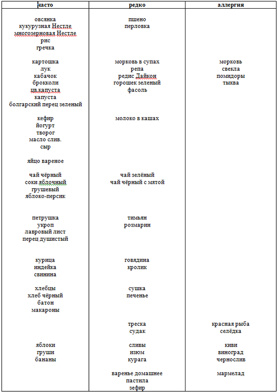 Наше менюГотовлюсь к походу к аллергологу и составила табличку продуктов, которые сейчас едим. Подскажите, что ещё едят ваши детки, которым около 3-х лет уже? Чем разнообразить питание?