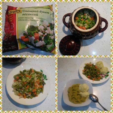 Весеннюю смесь (цв.капуста, брокколи, морковь, зеленый горошек, струч.фасоль) промыла, положила в горшочек, чуть воды и соли, в духовку до готовности, взбила блендером и добавила чуть раст.масла![]()