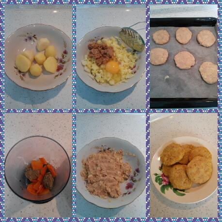Картофель и морковь отварить в подсоленной воде (можно без морковки), отдельно отварить мясо (у меня говядина). Слить воду с картофеля, добавить слив.масло и размять толкушкой, вареное мясо и морковь измельчила в блендере, все смешать и добавить одно яйцо, слепить котлетки и поджарить или выпекать в духовке.