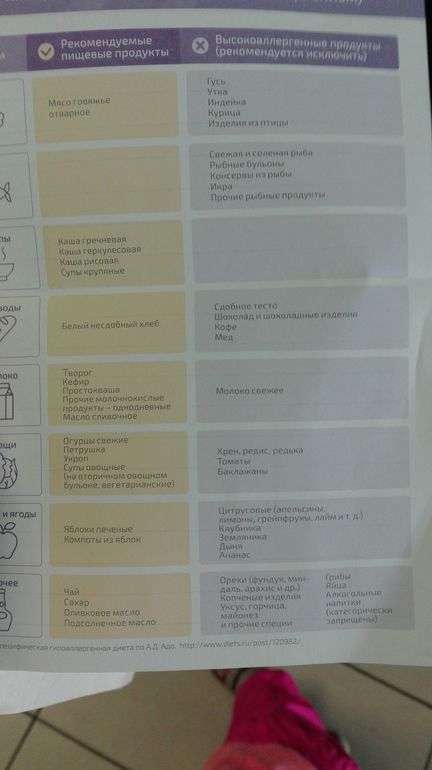 Меню для аллергичных детейДочке 1,9, полторы недели назад пошла бесцаетная сыпь по животу и рукам...Сходили к врачу по поводу сыпи-которая, кстати, еще и покраснела пару дней назад. Сказали, диатез, посадили нас на жёсткую диету на неделю, с надеждой на улучшение. Дали вот такую табличку продуктов (слева то, что можно, справа-то,что нельзя). Вопрос-что приготовить из этого? Реально можно ли только говядина из мяса?(ее ж нельзя каждый день давать....)