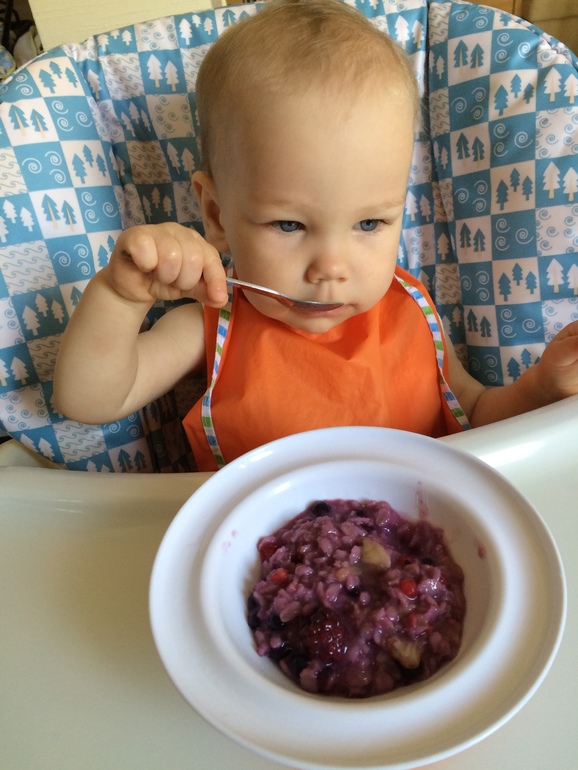 На завтрак у нас стандартно безмолочная каша. Последнее время мы подсели на овсянку, варьируем фруктовые составляющие в ней.