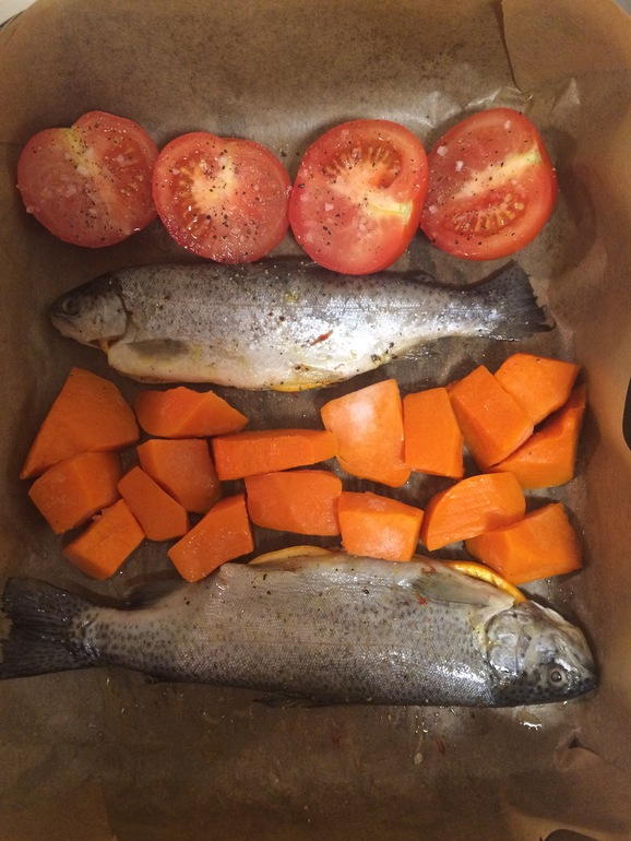 Рыбу я запекаю в духовке или готовлю на пару. Это может быть любая белая морская рыба (дорадо, сибасс) или красная (семга, форель). Странное сочетание овощей на фото. Но родители едят на гарнир помидоры, а ребенок тыкву. Помидоры у нее пока еще не в почете.