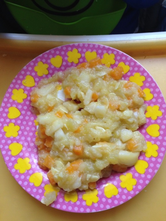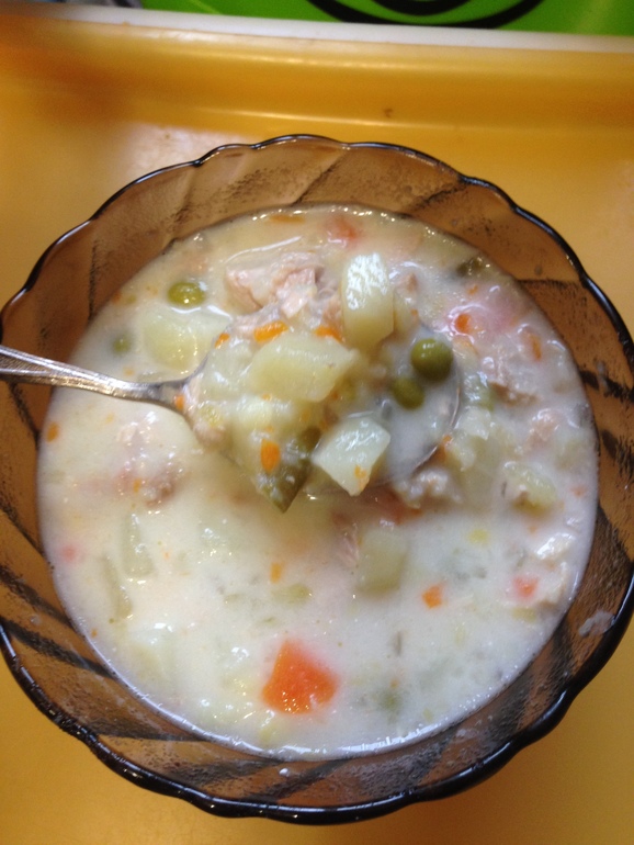овощной со сметаной: картофель, курица, морковь, кабачок, репка, зел горошек, лук;