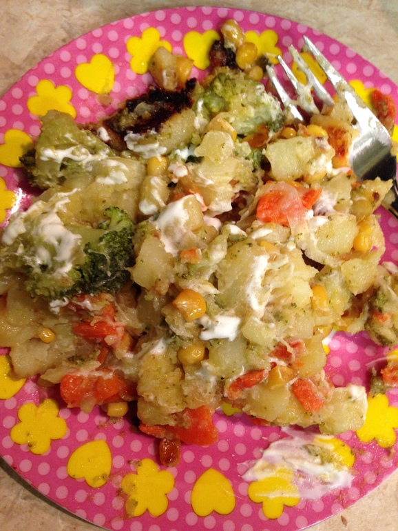 Картофель, цв капуста, брокколи, кукуруза. Все на сковороде. Заправила сметаной;