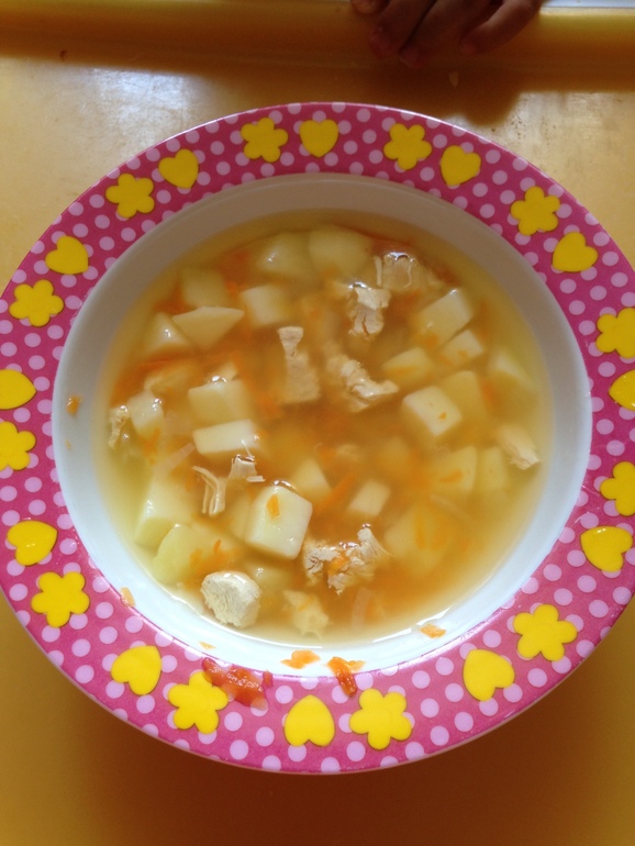 Обычный суп на курином бульоне с кусочками филе, морковкой, луком и картофелем.