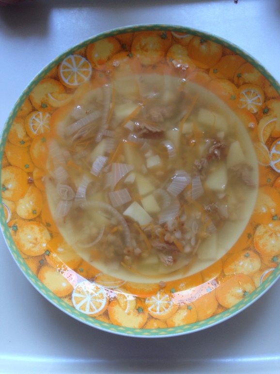 Суп на говядине с картофемем, морковкой, луком и гречкой;