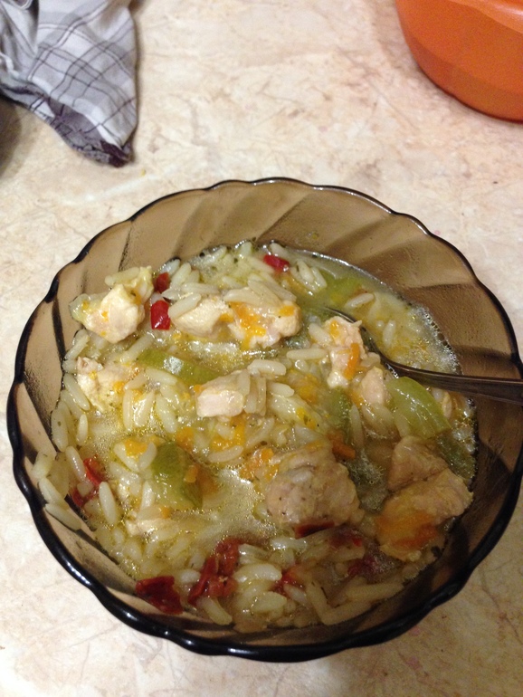 Овощное рагу с рисом: перец, рис, курица, морковка, лук, кабачок. ;