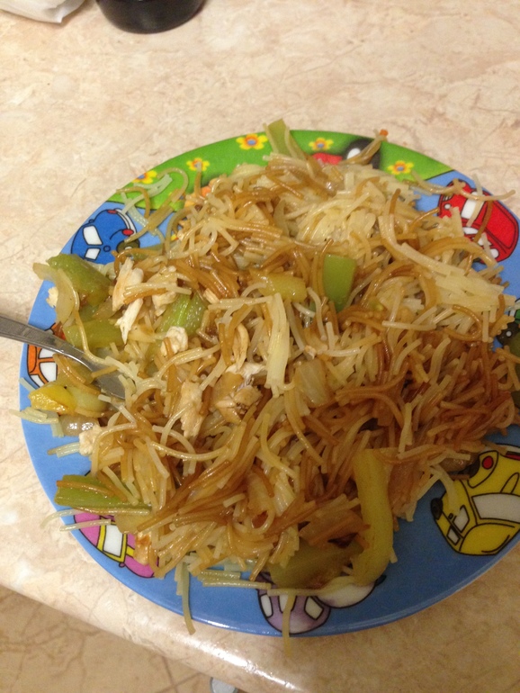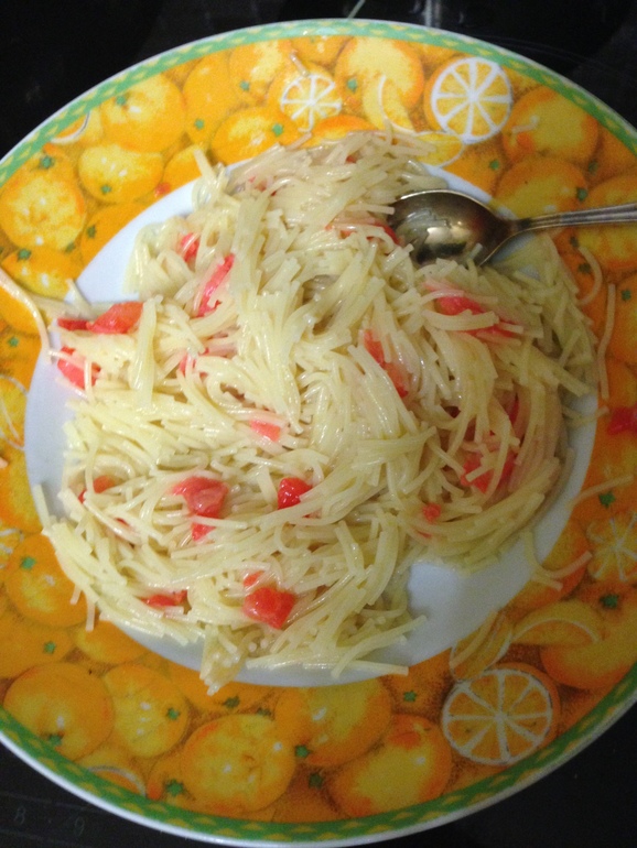 Лапша "паутинка", сваренная 3 мин на молоке + слив масло + ложка сахара;