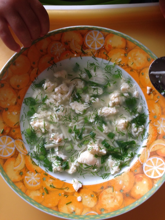 суп на курином бульоне с омлетом (без масла), лапшой и свежей зеленью