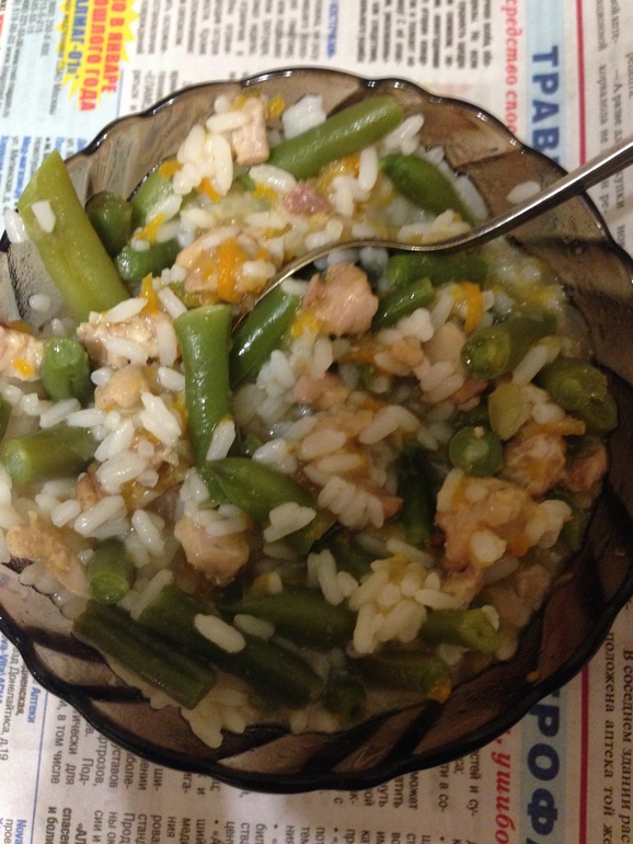 Индюшка, рис, фасоль стручковая, морковь и лук. Тушила все вместе;