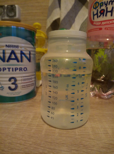 Наливаем как написано в инструкции 210 мл теплой воды в бутылочку и насыпаем 7 мерных ложечек смеси.