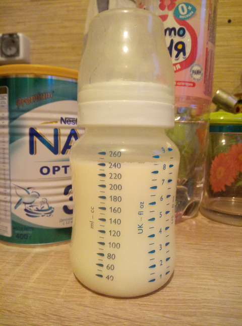 Как заявлено в инструкции можно просто взболтать бутылочку и смесь размешается. Пробуем. Все так и есть: смесь размешалась, комочков не видно. Причем даже не требуется сильно взбалтывать. совсем немного пениться, но если подождать 20 -30 секунд, то вся пенка спадает. На выходе получилось 240 мл смеси.