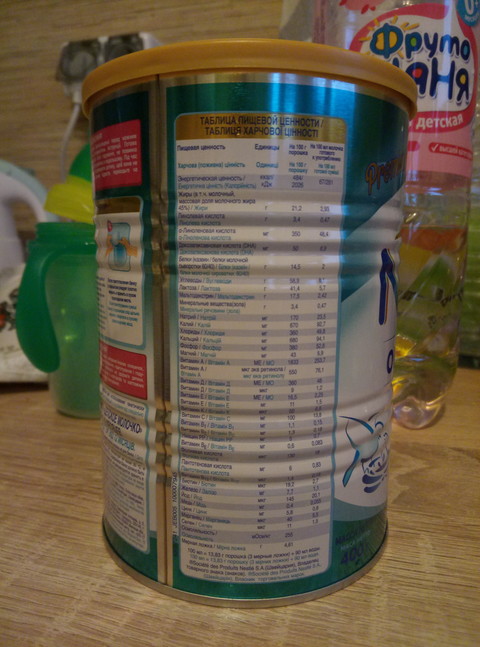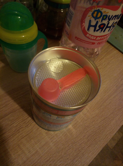 Очень удобная банка с мерной ложечкой. Мерная ложечка кладется сверху на края банки, благодаря чему не соприкасается со смесью. Банка герметично закрыта фольгой. Особенно удобно после Nestogen, который идет просто в пакетах, упакованных в коробку. В этой банке гораздо удобнее хранить смесь.