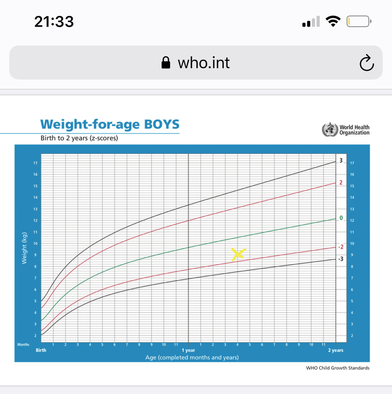 Не стоит 🙂 по всем параметрам - у него абсолютно нормальный вес. Вот график ВОЗ. Ваш вес я обозначила крестиком крестиком. «Маленький вес» находится за пределами красной линии. Все, что между - норма.