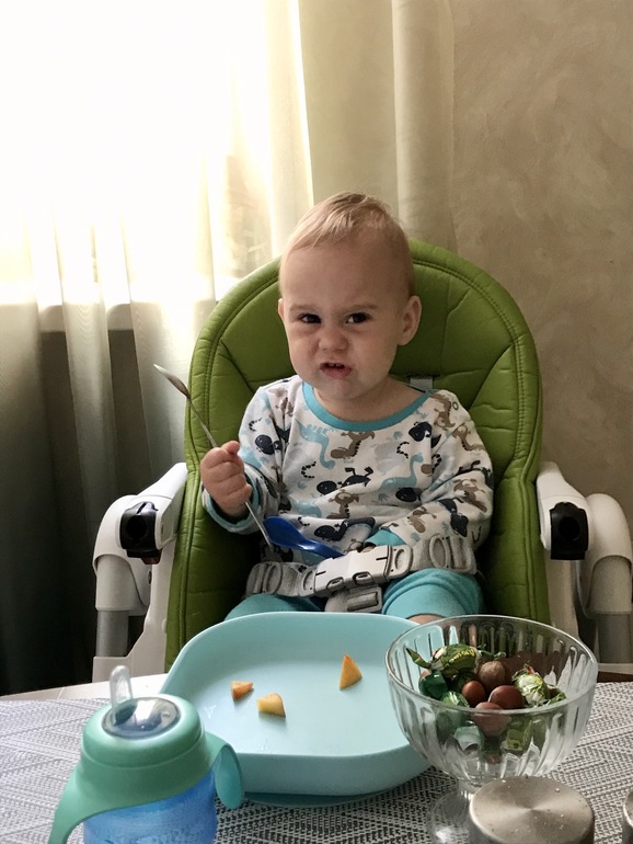 Главная проблема в еде была в том, что он не позволял кормить себя ложкой. Возьму одну - отбирает. Вторую тоже отберёт. И на третью с едой не открывает рот категорически. А себе самому в рот поместить еду с помощью ложки пока ещё сложно. Чаще почему-то еда приземлялась на уши.