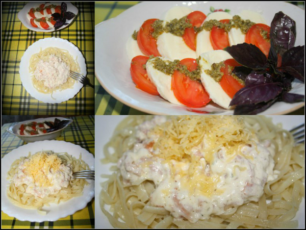 Ну и закончилась наша выходная вылазка ужином,заботливо приготовленного любимым мужем...Маленькая Италия от Эндрю моего;)))(паста карбанара,помидоры с сыром моцарелой,соусом песто и базиликом)
