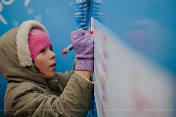 В огромной поздравительной открытке оставляли волшебнику свои пожелания.