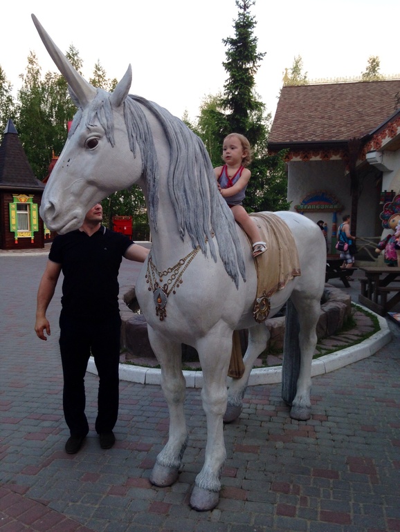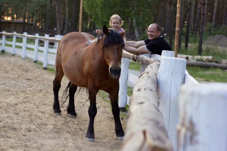 А дочке конь. Покормила его травой и посидела верхом. А еще папа с дочерью на шее, убегал, а конь догонял их, бегая вдоль ограды. В итоге, впечатлений масса!