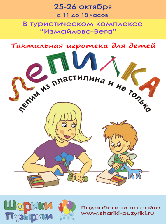 РазноеПриглашаем детей в возрасте от 2 до 12 лет и их родителей на тактильную игротеку "Лепилка", которая пройдёт 25 и 26 октября с 11 до 18 часов в зале "Кандинский-Шагал" туристического комплекса "Измайлово-Вега" (м.Партизанская, Измайловское шоссе, 71, корп. 3В).