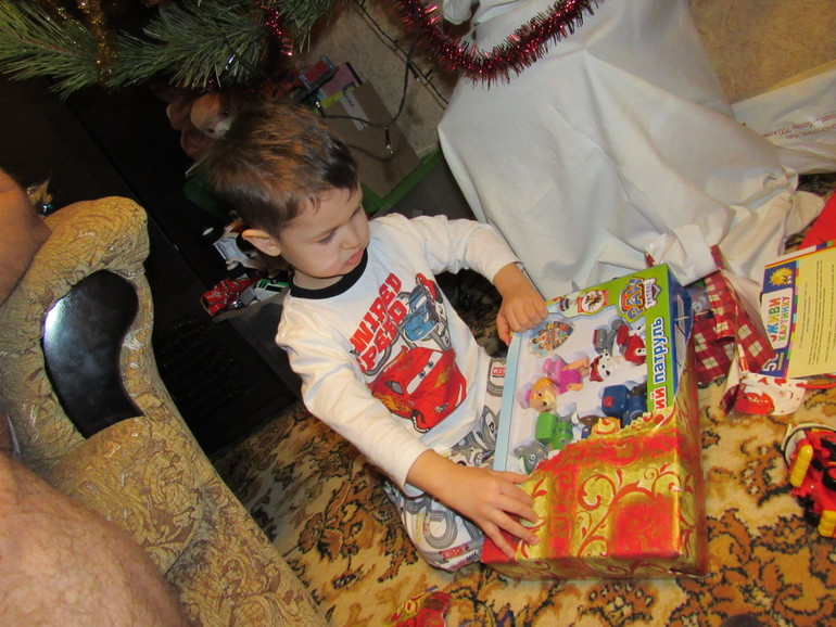 Подарки я подписала все и сложила под елку, так как был у нас договор, что Юра как помощник деда Мороза, всем утром подарки раздаст, которые ночью этот самый Мороз и принесет. Так и было. Больше всего конечно было подарков для Юры))))) Момент раскрытия щенячьего патруля запечатлен, робокаров сфоткать не успела: