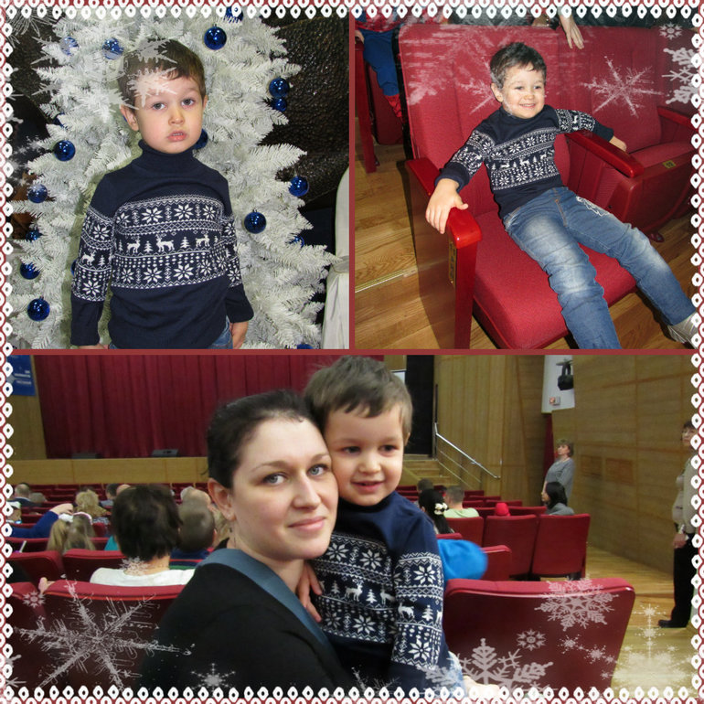 26го пошли с сыном на Ёлку в ДК. и небольшой спектакль был. Скажу честно, большей порнографии я еще в жизни не видела, но это отдельный рассказ. Спектакль сын просидел весь, правда потом сказал что ему совершенно не понравилось! И правильно! мне тоже))))) с елки свалил. утомился после спектакля и на хороводы сил не осталось. как компенсация за плохой спектакль, мною был куплен огромный шар в виде самолета. вот мы в зале и в фойе ДК: