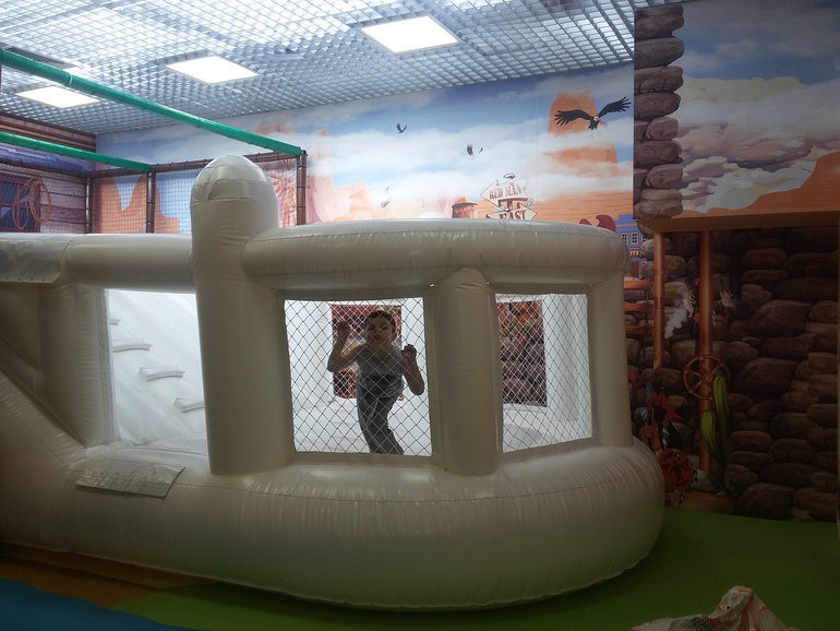 Но через пол часа пришли отмечать день рождения человек 15 детей с родителями и домик закрыли. Да и на всей площадке стало не протолкнуться из-за пришедших годовасиков с мамами (для них вход бесплатный). Думаю, что все же надо делать ограничения по количеству! Вешалка упала, за вещами никто не следит, туалет всего один. Даже фотограф, пытавшаяся поймать в кадр по возможности одного ребенка, и та махнула рукой. Тем более, что картридер испортился и наши фото было не напечатать. Пришлось нам идти в ресторанный дворик обедать, пока она ходила за новым оборудованием.