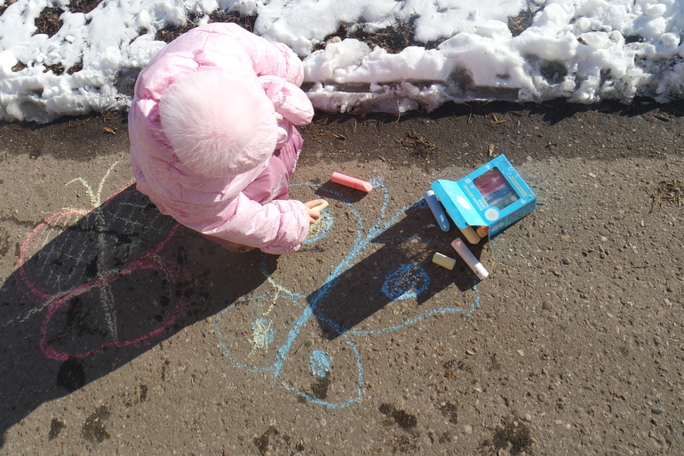 На солнечном асфальте рисовали бабочки. (Кстати,12 больших ярких мелков из FixPrice-- за такие деньги я и в дс взяла)