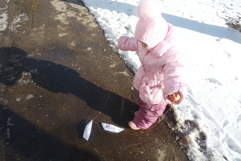 Лиза с папой сделали бумажные кораблики, раскрасили, прокатили маленькие игрушки т пошли гулять. Вчера шёл снег...лужи сегодня мелки)))) Лизе очень понравилось кататься кораблики за веревочку.