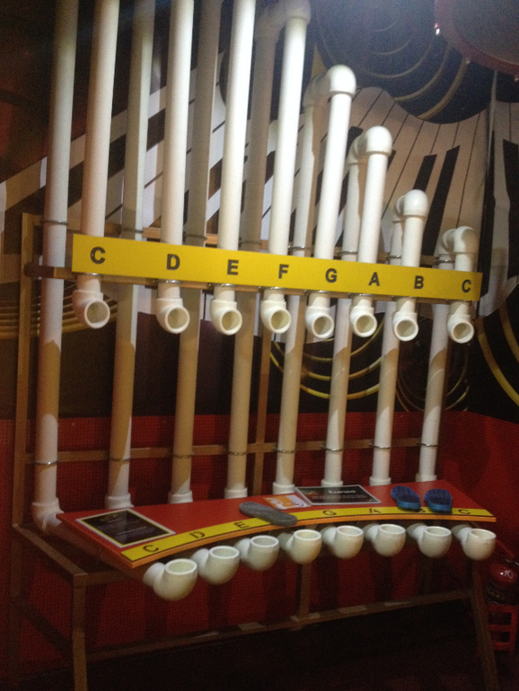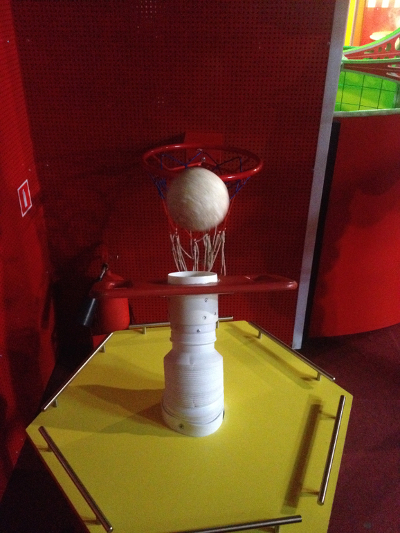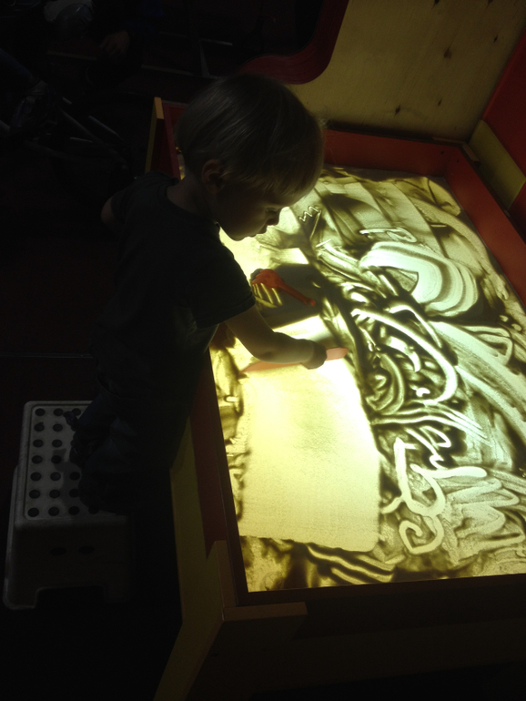 В парке 2 этажа. Первый - это не слишком большой зал, где по всей площади расставлены разные познавательно-развлекательные агрегаты. Воздушная пушка, иллюзорная комната, магниты, песок,... Все можно трогать, пробовать, экспериментировать. Походили, понажимали кнопочки, покрутили педальки, порисовали песком. Единственное, что очень понравилось всей семье - это барабанная установка)))) Зал не очень большой (думаю, что в выходные там давка и очереди могут быть).