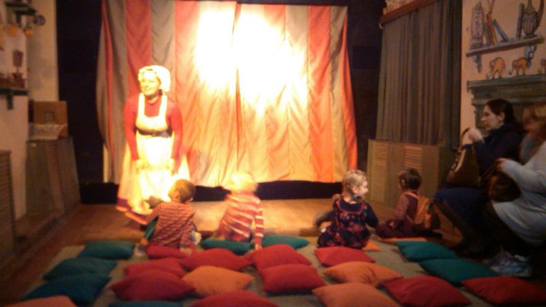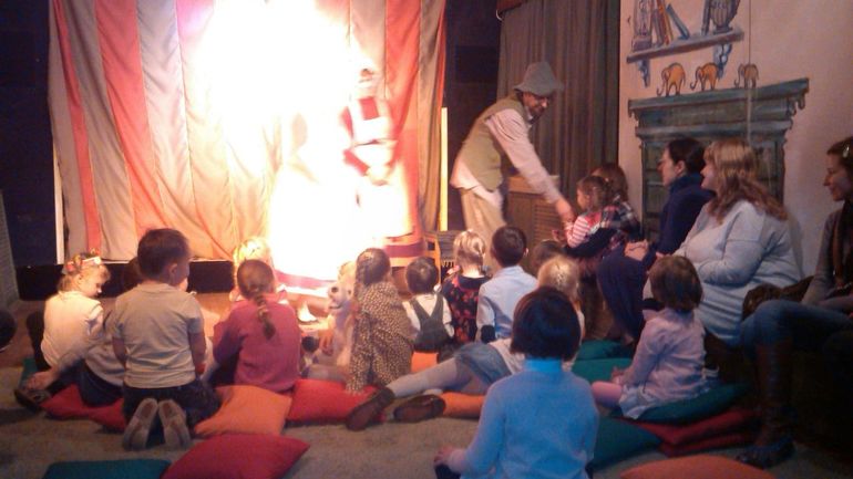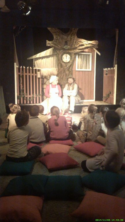 Пускают в театр за 15 минут до представления, так что нет смысла приходить раньше. Детям нужна сменная обувь, родителям - бахилы. Интересно оформлен интерьер: