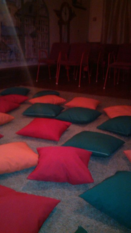 Маленький зал с подушками на ковре для детей и стульями для взрослых: