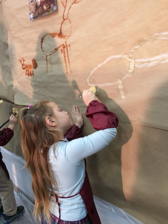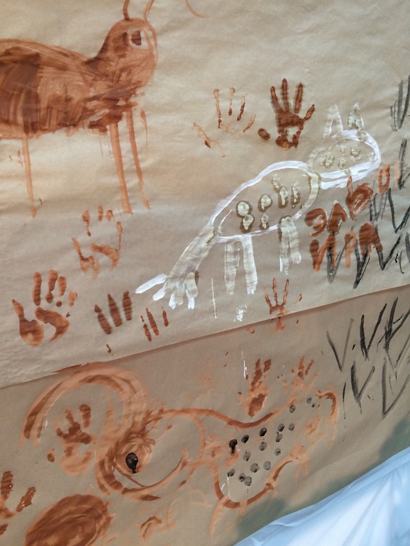Кисти делают из палок и поролона, а затем Сказка показывает картинки первобытных рисунков и детки запоминают-угадывают, что будут творить.