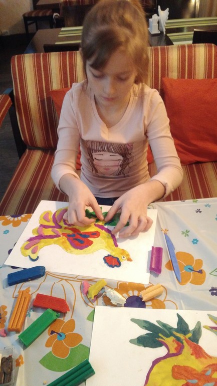 После того,как были сделаны штук 5,блюдо отправилось готовиться. Ученица пошла на творческий мастер-класс по пластилиновой живописи. Она выбрала "ЖАРПТИЦУ"