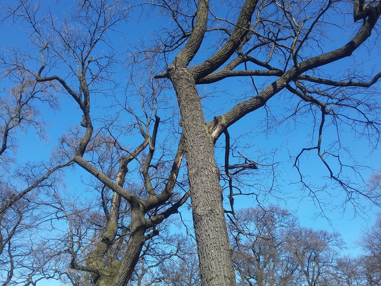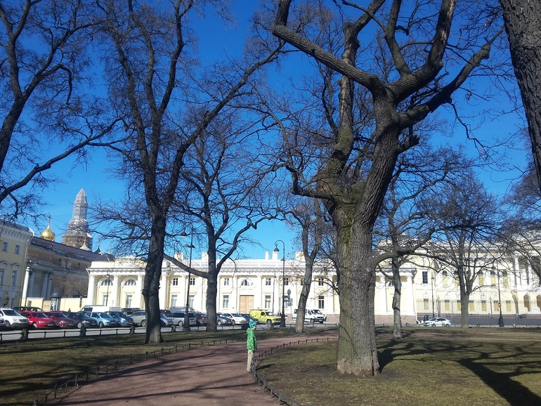 Вспомнили кавалерию и инфантерию. Затем дошли до Михайловского театра (пока совсем не хочет в театр ни на спектакль, ни на балет, ни на мюзикл). На площади искусств увидел дерево с огромным дуплом и рванул к нему через дорогу. Мальчишка! А я подняла голову к небу: