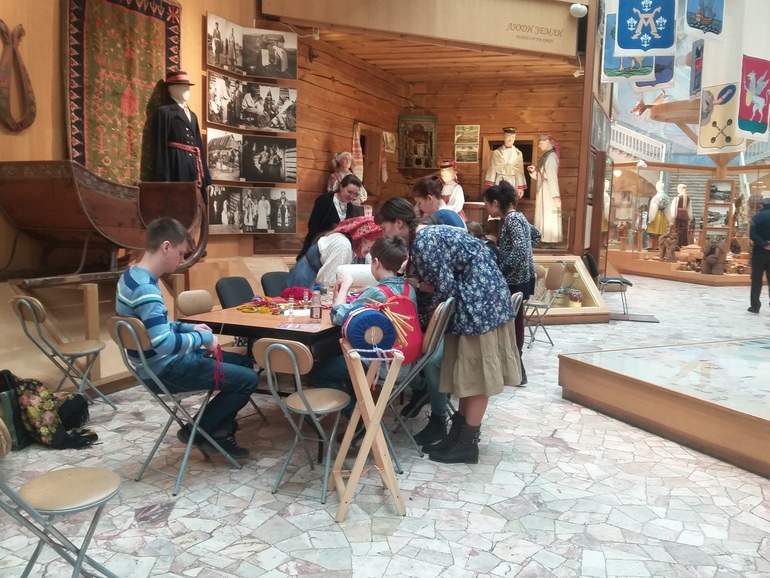 Программ в музее много, народа уйма. Поэтому всем деткам нашей группы приклеили бейджики. Организатор тот же, а вот детей в группе было слишком много в этот раз - 21 человек. И 20 родителей. Ходили огромной толпой по музею, что было очень некомфортно. Тем более, что в музее сейчас много различных мастер-классов: бисероплетение, вышивка, вязание, плетение кружев: