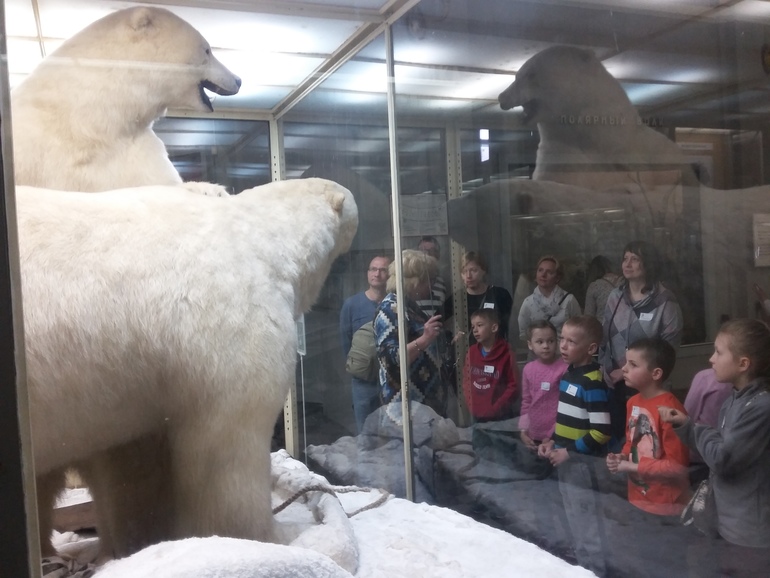 У витрины с белыми медведями мы поняли и запомнили что арктусы (медведи) никогда не встретятся с пингвинами, так как живут на разных полюсах Земли: